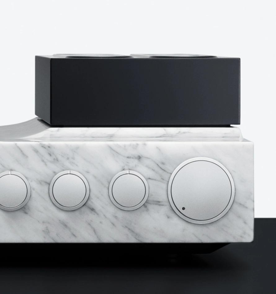 Vẻ đẹp lộng lẫy của đá tự nhiên cao cấp không chỉ mang đến nét trang nhã mà còn giúp triệt tiêu tiếng ồn rung, bảo đảm trải nghiệm âm nhạc trong trẻo và tinh khiết. Để tôn vinh thêm vẻ đẹp kiêu sa, các nút điều khiển được chế tác tỉ mỉ với chất lượng đỉnh cao. Mỗi nút được phay từ một khối đồng nguyên chất trước khi được mạ crôm sáng bóng. Chiếc loa này chính là sự hóa thân của âm nhạc thành một vật thể nghệ thuật.